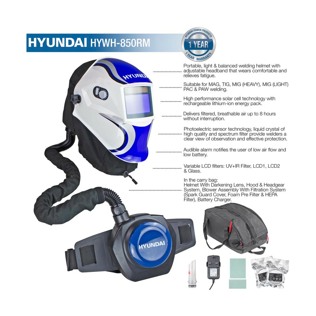 The HYWH-850RM is a professional air fed welding helmet from Hyundai, featuring solar auto-dimming with spectral filtering technology, photoelectric sensors and liquid crystal light control technology, the HYWH-850RM offers full head respiratory protection to the welder, the perfect welding solution for welders in the most demanding conditions where filtered air is a must for a safe and comfortable working environment.